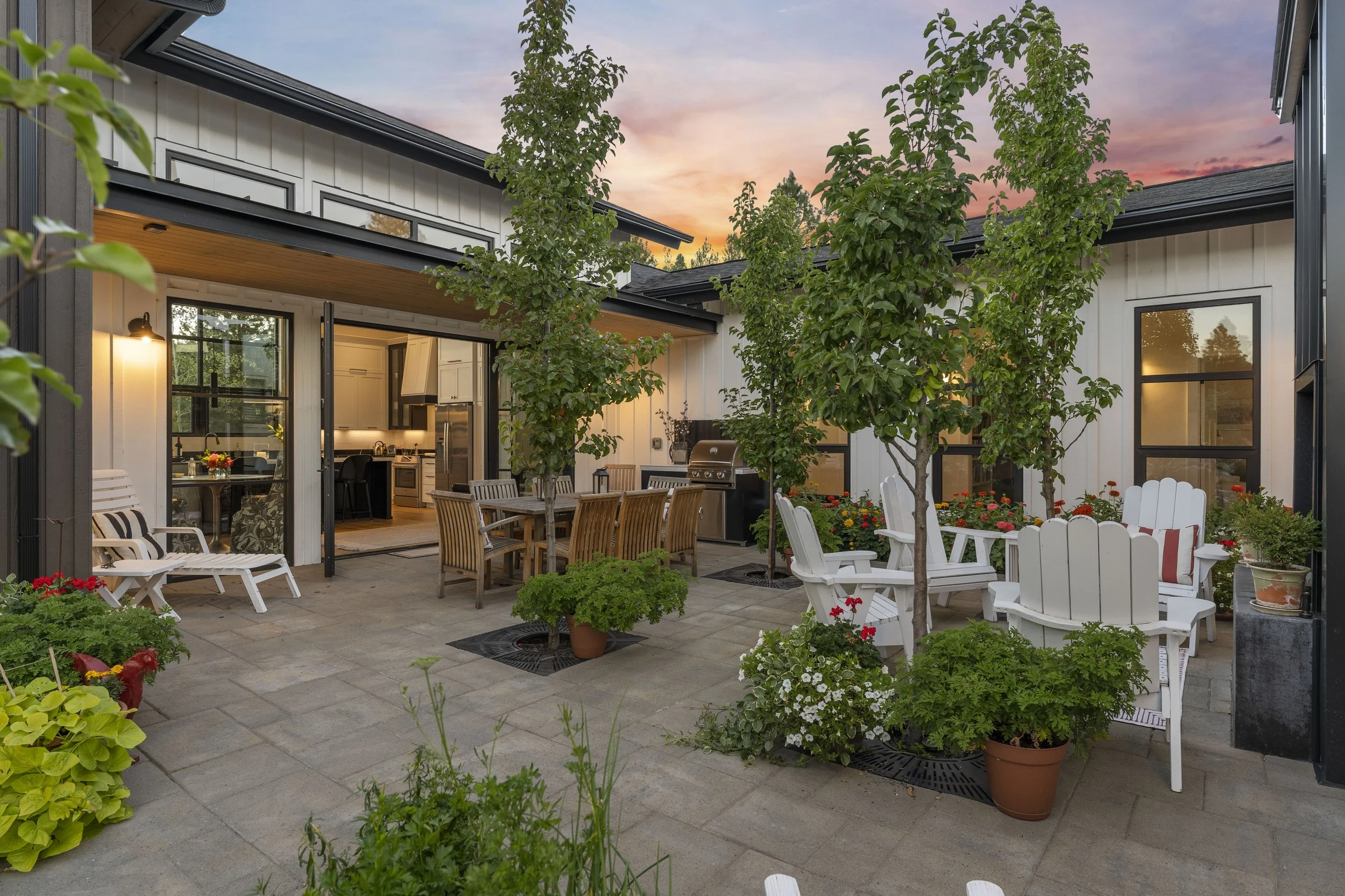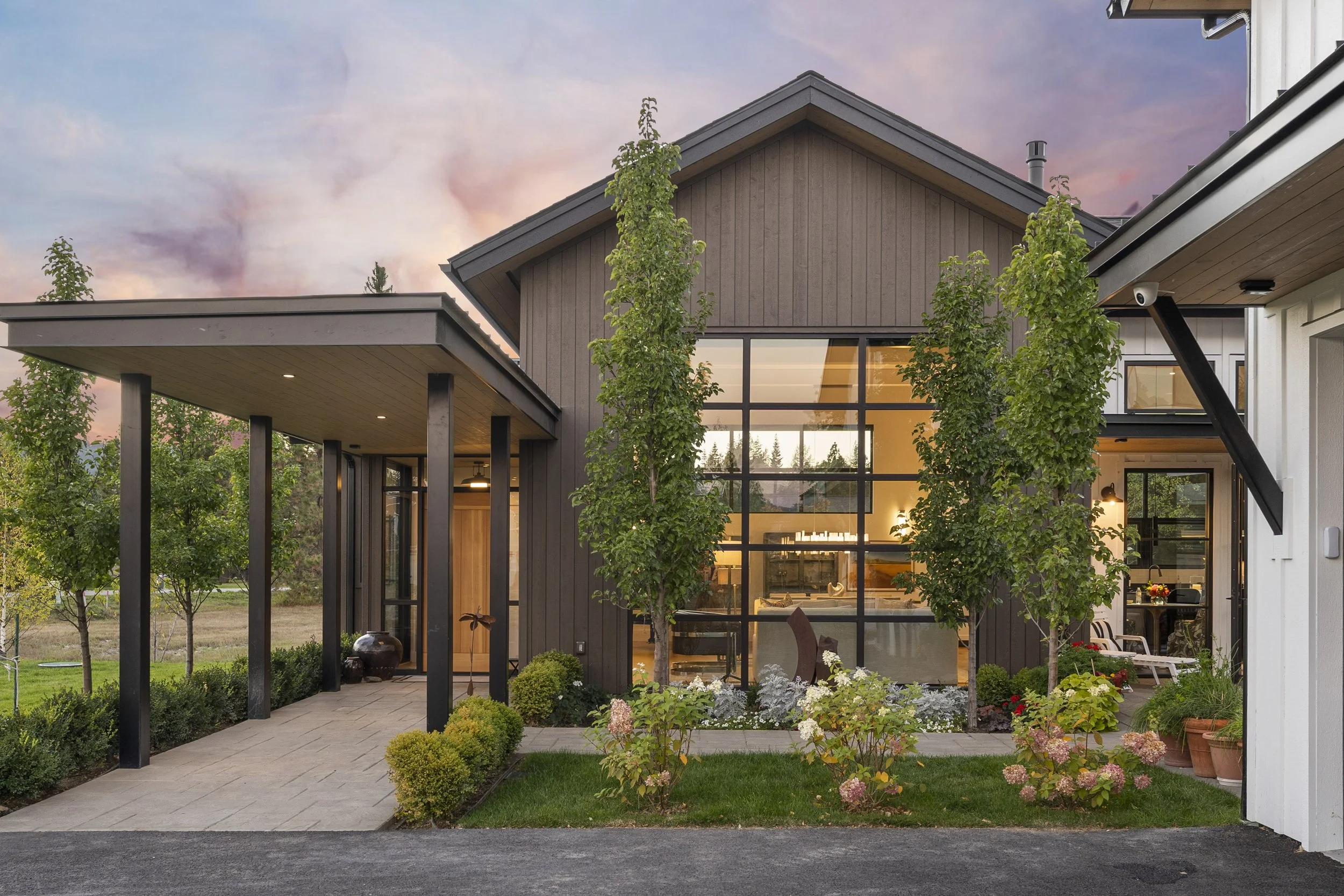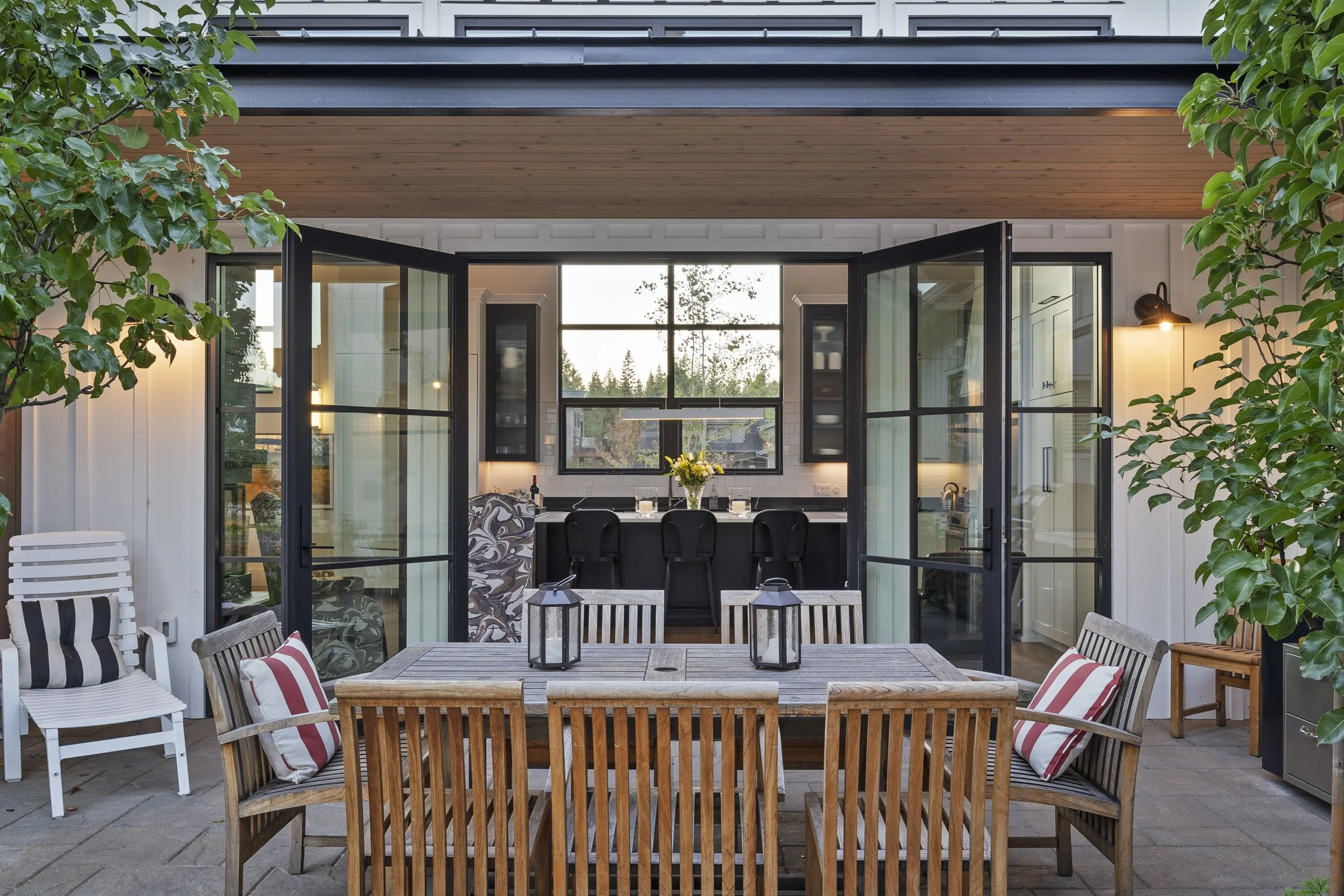 This home stands out for us as a twist on the modern farmhouse. The house is built around the central courtyard to create outdoor privacy in an urban area. To modernize the farmhouse idea, we used color and large industrial-style windows that unite the indoor and outdoor into one living space. We designed entrance columns to match the rhythm of trees that line the entryway—demonstrating how traditional styles can be thoughtfully reinterpreted into one-of-a-kind homes that respond uniquely to their environment.